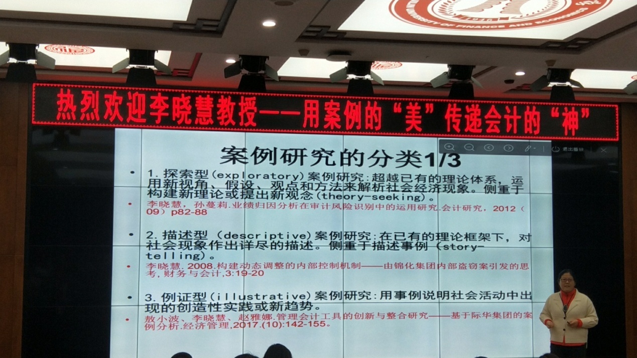 11月14日下午2:00,中央财经大学会计学院教授、博士生导师、首批资深注册会计师(非执业会员)、中国会计学会审计监督委员会委员、中国注册会计师协会专业技术咨询委员会委员、亚洲风险与危机管理协会(AARCM)CERM资格证书专家认证(中国)委员会委员李晓慧教授,应会计学院邀请,来我校第一教学楼1202开展题为“用案例的‘美’传递会计的‘神’”的专题报告。首先,李教授为同学们介绍了案例研究到底是什么,有哪几种分类,解释了实证研究与案例研究最主要区别是什么,从而引出案例研究“美”在哪里这个话题,告诉同学们案例研究有着创新性、时效性和前瞻性;并且不需要大样本数据,用假设、观点和方法就能解析社会经济现象,还能增加细分的感性认识。这几种区别于实证研究的特点正是案例研究“美”的地方。