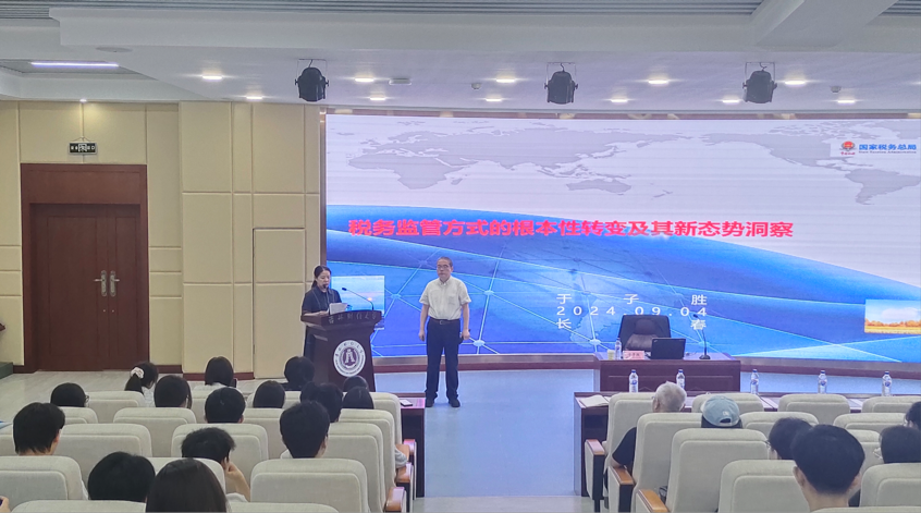 本网讯(税务学院)9月4日下午,税务学院邀请我校优秀校友、国家税务总局原二级巡视员于子胜作题为“税务监管方式的根本性转变及其新态势洞察”的学术报告。税务学院教师及研究生参加了报告会。报告会由税务学院院长张巍主持。