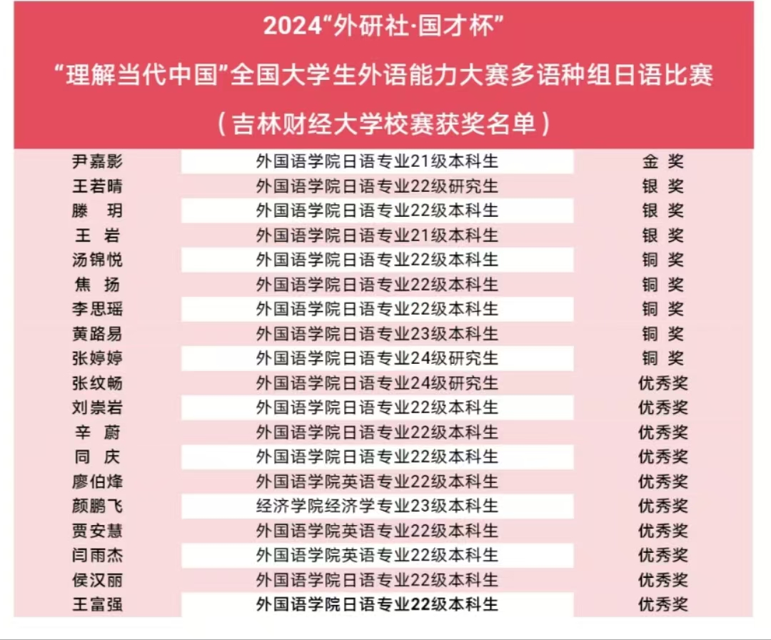 本网讯(外国语学院)金秋九月,2024“外研社·国才杯”“理解当代中国”全国大学生外语能力大赛多语种组日语组yl6809永利集团校赛(以下简称“校赛”)圆满落幕。校赛由yl6809永利集团外国语学院、公共外语教研部共同承办,吸引了我校30余名在校本科生与硕士研究生的踊跃参与。经过激烈角逐,外国语学院日语专业2021级本科生尹嘉影同学凭借优异表现荣获校赛金奖,王若晴、滕玥、王岩三名同学获得银奖,汤锦悦、焦扬、李思瑶、黄路易、张婷婷五名同学获得铜奖,张纹畅、刘崇岩等10名同学获得优秀奖。