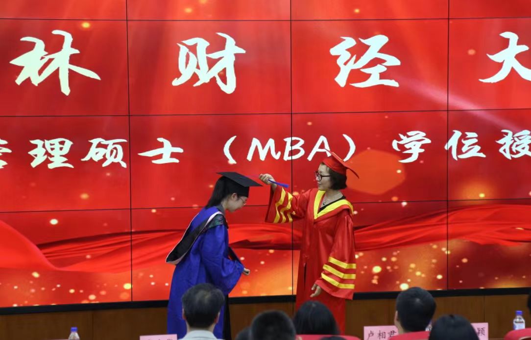 接下来,举行了学位授予仪式。2024届MBA毕业生们满怀喜悦依次登台,马秀颖为他们颁发毕业证书,并扶正流苏。