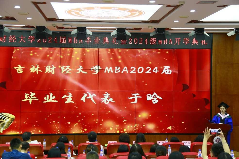 毕业生代表于晗在毕业感言中,回顾了攻读我校MBA的梦想初心,回忆了在校逐梦圆梦的珍贵时光,表达了对学校培养的感恩之情,感谢老师们的学海引领及同学们的陪伴深情,表示在新征程上奋楫扬帆,赓续前行,深耕岗位,再立新功的坚定决心。